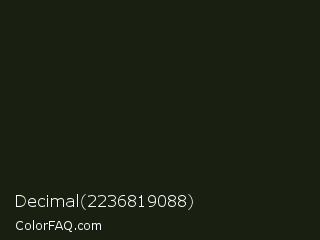 Decimal 2236819088 Color is a very dark green color and the nearest color is Rangoon Green #1c1e13. Hex code #192012 and RGB value is rgb(25,32,18). In RGB color space, this color is composed of 10% red, 13% green, 7% blue, In CMYK color space, this color is composed of 22% cyan, 0% magenta, 44% yellow , 87% black , In HSL color space, this color has a hue angle of 90° , 28% saturation and 10% lightness.