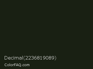 Decimal 2236819089 Color is a very dark green color and the nearest color is Rangoon Green #1c1e13. Hex code #192013 and RGB value is rgb(25,32,19). In RGB color space, this color is composed of 10% red, 13% green, 7% blue, In CMYK color space, this color is composed of 22% cyan, 0% magenta, 41% yellow , 87% black , In HSL color space, this color has a hue angle of 92° , 25% saturation and 10% lightness.