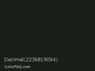 Decimal 2236819094 Color is a very dark green color and the nearest color is Eerie Black #1b1b1b. Hex code #192018 and RGB value is rgb(25,32,24). In RGB color space, this color is composed of 10% red, 13% green, 9% blue, In CMYK color space, this color is composed of 22% cyan, 0% magenta, 25% yellow , 87% black , In HSL color space, this color has a hue angle of 113° , 14% saturation and 11% lightness.