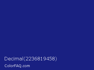 Decimal 2236819458 Color is a dark blue color and the nearest color is Jacksons Purple #20208d. Hex code #192082 and RGB value is rgb(25,32,130). In RGB color space, this color is composed of 10% red, 13% green, 51% blue, In CMYK color space, this color is composed of 81% cyan, 75% magenta, 0% yellow , 49% black , In HSL color space, this color has a hue angle of 236° , 68% saturation and 30% lightness.