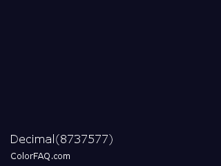 Decimal 8737577 Color is a almost black blue color and the nearest color is Deep Ebony #0c0b1d. Hex code #0d0d21 and RGB value is rgb(13,13,33). In RGB color space, this color is composed of 5% red, 5% green, 13% blue, In CMYK color space, this color is composed of 61% cyan, 61% magenta, 0% yellow , 87% black , In HSL color space, this color has a hue angle of 240° , 43% saturation and 9% lightness.
