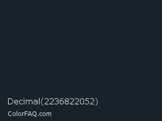 Decimal 2236822052 Color is a very dark blue color and the nearest color is Dark Jungle Green #1a2421. Hex code #192228 and RGB value is rgb(25,34,40). In RGB color space, this color is composed of 10% red, 13% green, 16% blue, In CMYK color space, this color is composed of 38% cyan, 15% magenta, 0% yellow , 84% black , In HSL color space, this color has a hue angle of 204° , 23% saturation and 13% lightness.