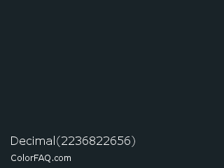 Decimal 2236822656 Color is a very dark blue color and the nearest color is Dark Gunmetal #1f262a. Hex code #192328 and RGB value is rgb(25,35,40). In RGB color space, this color is composed of 10% red, 14% green, 16% blue, In CMYK color space, this color is composed of 38% cyan, 13% magenta, 0% yellow , 84% black , In HSL color space, this color has a hue angle of 200° , 23% saturation and 13% lightness.