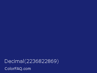 Decimal 2236822869 Color is a dark blue color and the nearest color is Midnight Blue #191970. Hex code #192373 and RGB value is rgb(25,35,115). In RGB color space, this color is composed of 10% red, 14% green, 45% blue, In CMYK color space, this color is composed of 78% cyan, 70% magenta, 0% yellow , 55% black , In HSL color space, this color has a hue angle of 233° , 64% saturation and 27% lightness.