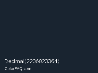 Decimal 2236823364 Color is a very dark blue color and the nearest color is Dark Gunmetal #1f262a. Hex code #192430 and RGB value is rgb(25,36,48). In RGB color space, this color is composed of 10% red, 14% green, 19% blue, In CMYK color space, this color is composed of 48% cyan, 25% magenta, 0% yellow , 81% black , In HSL color space, this color has a hue angle of 211° , 32% saturation and 14% lightness.