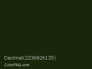 Decimal 2236826135 Color is a almost black green color and the nearest color is Deep Forest Green #182d09. Hex code #192609 and RGB value is rgb(25,38,9). In RGB color space, this color is composed of 10% red, 15% green, 4% blue, In CMYK color space, this color is composed of 34% cyan, 0% magenta, 76% yellow , 85% black , In HSL color space, this color has a hue angle of 87° , 62% saturation and 9% lightness.