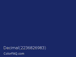 Decimal 2236826983 Color is a dark blue color and the nearest color is Biscay #1b3162. Hex code #192767 and RGB value is rgb(25,39,103). In RGB color space, this color is composed of 10% red, 15% green, 40% blue, In CMYK color space, this color is composed of 76% cyan, 62% magenta, 0% yellow , 60% black , In HSL color space, this color has a hue angle of 229° , 61% saturation and 25% lightness.
