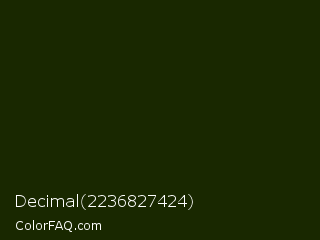 Decimal 2236827424 Color is a almost black green color and the nearest color is Pine Tree #171f04. Hex code #192800 and RGB value is rgb(25,40,0). In RGB color space, this color is composed of 10% red, 16% green, 0% blue, In CMYK color space, this color is composed of 38% cyan, 0% magenta, 100% yellow , 84% black , In HSL color space, this color has a hue angle of 83° , 100% saturation and 8% lightness.