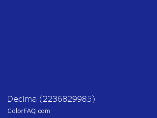 Decimal 2236829985 Color is a normal blue color and the nearest color is Jacksons Purple #20208d. Hex code #192991 and RGB value is rgb(25,41,145). In RGB color space, this color is composed of 10% red, 16% green, 57% blue, In CMYK color space, this color is composed of 83% cyan, 72% magenta, 0% yellow , 43% black , In HSL color space, this color has a hue angle of 232° , 71% saturation and 33% lightness.