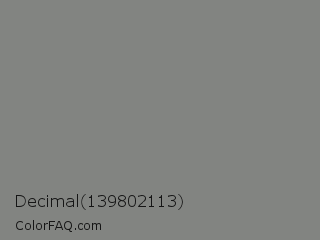 Decimal 139802113 Color is a normal green color and the nearest color is Battleship Grey #848482. Hex code #828481 and RGB value is rgb(130,132,129). In RGB color space, this color is composed of 51% red, 52% green, 51% blue, In CMYK color space, this color is composed of 2% cyan, 0% magenta, 2% yellow , 48% black , In HSL color space, this color has a hue angle of 100° , 1% saturation and 51% lightness.