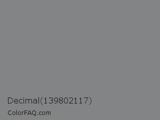 Decimal 139802117 Color is a normal blue color and the nearest color is Gunsmoke #828685. Hex code #828485 and RGB value is rgb(130,132,133). In RGB color space, this color is composed of 51% red, 52% green, 52% blue, In CMYK color space, this color is composed of 2% cyan, 1% magenta, 0% yellow , 48% black , In HSL color space, this color has a hue angle of 200° , 1% saturation and 52% lightness.