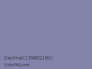 Decimal 139802180 Color is a normal blue color and the nearest color is Shadow Blue #778ba5. Hex code #8284ac and RGB value is rgb(130,132,172). In RGB color space, this color is composed of 51% red, 52% green, 67% blue, In CMYK color space, this color is composed of 24% cyan, 23% magenta, 0% yellow , 33% black , In HSL color space, this color has a hue angle of 237° , 20% saturation and 59% lightness.