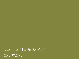 Decimal 139802512 Color is a normal yellow color and the nearest color is Old Moss Green #867e36. Hex code #82853e and RGB value is rgb(130,133,62). In RGB color space, this color is composed of 51% red, 52% green, 24% blue, In CMYK color space, this color is composed of 2% cyan, 0% magenta, 53% yellow , 48% black , In HSL color space, this color has a hue angle of 63° , 36% saturation and 38% lightness.