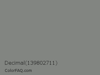 Decimal 139802711 Color is a normal green color and the nearest color is Battleship Grey #848482. Hex code #828581 and RGB value is rgb(130,133,129). In RGB color space, this color is composed of 51% red, 52% green, 51% blue, In CMYK color space, this color is composed of 2% cyan, 0% magenta, 3% yellow , 48% black , In HSL color space, this color has a hue angle of 105° , 2% saturation and 51% lightness.