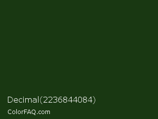 Decimal 2236844084 Color is a very dark green color and the nearest color is Palm Leaf #19330e. Hex code #193812 and RGB value is rgb(25,56,18). In RGB color space, this color is composed of 10% red, 22% green, 7% blue, In CMYK color space, this color is composed of 55% cyan, 0% magenta, 68% yellow , 78% black , In HSL color space, this color has a hue angle of 109° , 51% saturation and 15% lightness.