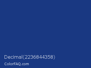 Decimal 2236844358 Color is a dark blue color and the nearest color is Bay Of Many #273a81. Hex code #193882 and RGB value is rgb(25,56,130). In RGB color space, this color is composed of 10% red, 22% green, 51% blue, In CMYK color space, this color is composed of 81% cyan, 57% magenta, 0% yellow , 49% black , In HSL color space, this color has a hue angle of 222° , 68% saturation and 30% lightness.