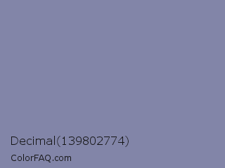 Decimal 139802774 Color is a normal blue color and the nearest color is Shadow Blue #778ba5. Hex code #8285a8 and RGB value is rgb(130,133,168). In RGB color space, this color is composed of 51% red, 52% green, 66% blue, In CMYK color space, this color is composed of 23% cyan, 21% magenta, 0% yellow , 34% black , In HSL color space, this color has a hue angle of 235° , 18% saturation and 58% lightness.