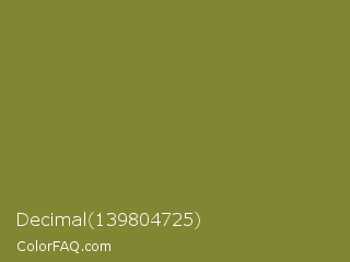 Decimal 139804725 Color is a normal yellow color and the nearest color is Old Moss Green #867e36. Hex code #828633 and RGB value is rgb(130,134,51). In RGB color space, this color is composed of 51% red, 53% green, 20% blue, In CMYK color space, this color is composed of 3% cyan, 0% magenta, 62% yellow , 47% black , In HSL color space, this color has a hue angle of 63° , 45% saturation and 36% lightness.
