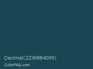 Decimal 2236884099 Color is a very dark cyan color and the nearest color is Blue Dianne #204852. Hex code #194653 and RGB value is rgb(25,70,83). In RGB color space, this color is composed of 10% red, 27% green, 33% blue, In CMYK color space, this color is composed of 70% cyan, 16% magenta, 0% yellow , 67% black , In HSL color space, this color has a hue angle of 193° , 54% saturation and 21% lightness.