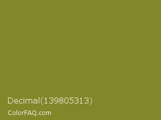 Decimal 139805313 Color is a normal yellow color and the nearest color is Wasabi #788a25. Hex code #828729 and RGB value is rgb(130,135,41). In RGB color space, this color is composed of 51% red, 53% green, 16% blue, In CMYK color space, this color is composed of 4% cyan, 0% magenta, 70% yellow , 47% black , In HSL color space, this color has a hue angle of 63° , 53% saturation and 35% lightness.