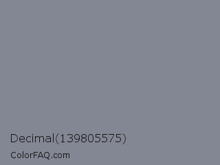 Decimal 139805575 Color is a normal blue color and the nearest color is Roman Silver #838996. Hex code #828793 and RGB value is rgb(130,135,147). In RGB color space, this color is composed of 51% red, 53% green, 58% blue, In CMYK color space, this color is composed of 12% cyan, 8% magenta, 0% yellow , 42% black , In HSL color space, this color has a hue angle of 222° , 7% saturation and 54% lightness.