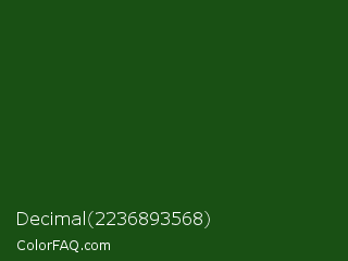 Decimal 2236893568 Color is a very dark green color and the nearest color is Parsley #134f19. Hex code #195014 and RGB value is rgb(25,80,20). In RGB color space, this color is composed of 10% red, 31% green, 8% blue, In CMYK color space, this color is composed of 69% cyan, 0% magenta, 75% yellow , 69% black , In HSL color space, this color has a hue angle of 115° , 60% saturation and 20% lightness.