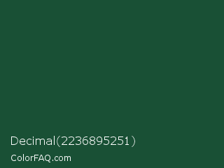 Decimal 2236895251 Color is a very dark green color and the nearest color is Brunswick Green #1b4d3e. Hex code #195035 and RGB value is rgb(25,80,53). In RGB color space, this color is composed of 10% red, 31% green, 21% blue, In CMYK color space, this color is composed of 69% cyan, 0% magenta, 34% yellow , 69% black , In HSL color space, this color has a hue angle of 151° , 52% saturation and 21% lightness.