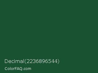 Decimal 2236896544 Color is a very dark green color and the nearest color is Cal Poly Pomona Green #1e4d2b. Hex code #195230 and RGB value is rgb(25,82,48). In RGB color space, this color is composed of 10% red, 32% green, 19% blue, In CMYK color space, this color is composed of 70% cyan, 0% magenta, 41% yellow , 68% black , In HSL color space, this color has a hue angle of 144° , 53% saturation and 21% lightness.
