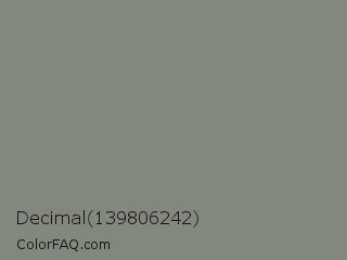 Decimal 139806242 Color is a normal green color and the nearest color is Battleship Grey #848482. Hex code #82887e and RGB value is rgb(130,136,126). In RGB color space, this color is composed of 51% red, 53% green, 49% blue, In CMYK color space, this color is composed of 4% cyan, 0% magenta, 7% yellow , 47% black , In HSL color space, this color has a hue angle of 96° , 4% saturation and 51% lightness.