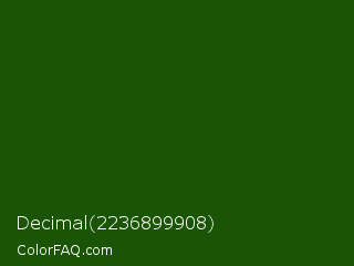 Decimal 2236899908 Color is a very dark green color and the nearest color is Lincoln Green #195905. Hex code #195504 and RGB value is rgb(25,85,4). In RGB color space, this color is composed of 10% red, 33% green, 2% blue, In CMYK color space, this color is composed of 71% cyan, 0% magenta, 95% yellow , 67% black , In HSL color space, this color has a hue angle of 104° , 91% saturation and 17% lightness.