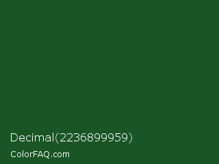 Decimal 2236899959 Color is a very dark green color and the nearest color is Cal Poly Pomona Green #1e4d2b. Hex code #195525 and RGB value is rgb(25,85,37). In RGB color space, this color is composed of 10% red, 33% green, 15% blue, In CMYK color space, this color is composed of 71% cyan, 0% magenta, 56% yellow , 67% black , In HSL color space, this color has a hue angle of 132° , 55% saturation and 22% lightness.