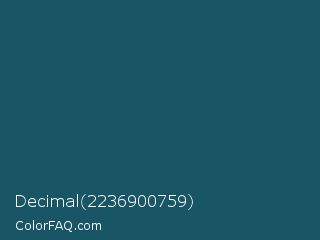 Decimal 2236900759 Color is a dark cyan color and the nearest color is Deep Sea Green #095859. Hex code #195665 and RGB value is rgb(25,86,101). In RGB color space, this color is composed of 10% red, 34% green, 40% blue, In CMYK color space, this color is composed of 75% cyan, 15% magenta, 0% yellow , 60% black , In HSL color space, this color has a hue angle of 192° , 60% saturation and 25% lightness.