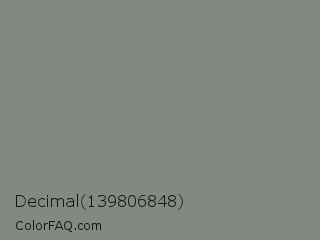 Decimal 139806848 Color is a normal green color and the nearest color is Battleship Grey #848482. Hex code #828980 and RGB value is rgb(130,137,128). In RGB color space, this color is composed of 51% red, 54% green, 50% blue, In CMYK color space, this color is composed of 5% cyan, 0% magenta, 7% yellow , 46% black , In HSL color space, this color has a hue angle of 107° , 4% saturation and 52% lightness.