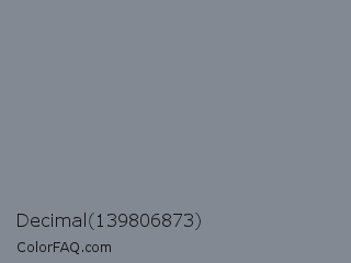 Decimal 139806873 Color is a normal blue color and the nearest color is Roman Silver #838996. Hex code #828993 and RGB value is rgb(130,137,147). In RGB color space, this color is composed of 51% red, 54% green, 58% blue, In CMYK color space, this color is composed of 12% cyan, 7% magenta, 0% yellow , 42% black , In HSL color space, this color has a hue angle of 215° , 7% saturation and 54% lightness.
