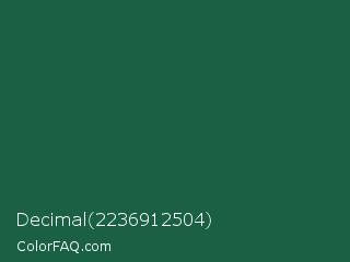 Decimal 2236912504 Color is a dark green color and the nearest color is Green Pea #1d6142. Hex code #196142 and RGB value is rgb(25,97,66). In RGB color space, this color is composed of 10% red, 38% green, 26% blue, In CMYK color space, this color is composed of 74% cyan, 0% magenta, 32% yellow , 62% black , In HSL color space, this color has a hue angle of 154° , 59% saturation and 24% lightness.
