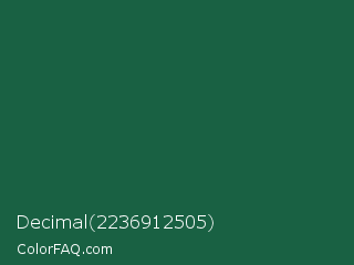Decimal 2236912505 Color is a dark green color and the nearest color is Green Pea #1d6142. Hex code #196143 and RGB value is rgb(25,97,67). In RGB color space, this color is composed of 10% red, 38% green, 26% blue, In CMYK color space, this color is composed of 74% cyan, 0% magenta, 31% yellow , 62% black , In HSL color space, this color has a hue angle of 155° , 59% saturation and 24% lightness.