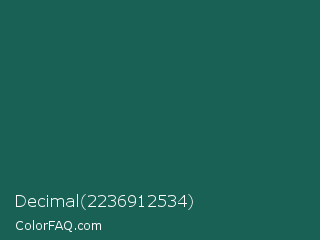 Decimal 2236912534 Color is a dark cyan color and the nearest color is Eden #105852. Hex code #196154 and RGB value is rgb(25,97,84). In RGB color space, this color is composed of 10% red, 38% green, 33% blue, In CMYK color space, this color is composed of 74% cyan, 0% magenta, 13% yellow , 62% black , In HSL color space, this color has a hue angle of 169° , 59% saturation and 24% lightness.