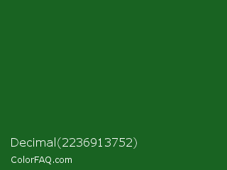Decimal 2236913752 Color is a dark green color and the nearest color is Parsley #134f19. Hex code #196322 and RGB value is rgb(25,99,34). In RGB color space, this color is composed of 10% red, 39% green, 13% blue, In CMYK color space, this color is composed of 75% cyan, 0% magenta, 66% yellow , 61% black , In HSL color space, this color has a hue angle of 127° , 60% saturation and 24% lightness.