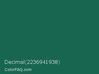 Decimal 2236941938 Color is a dark green color and the nearest color is Green Pea #1d6142. Hex code #196650 and RGB value is rgb(25,102,80). In RGB color space, this color is composed of 10% red, 40% green, 31% blue, In CMYK color space, this color is composed of 75% cyan, 0% magenta, 22% yellow , 60% black , In HSL color space, this color has a hue angle of 163° , 61% saturation and 25% lightness.