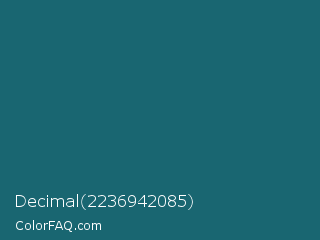 Decimal 2236942085 Color is a dark cyan color and the nearest color is Genoa #15736b. Hex code #196671 and RGB value is rgb(25,102,113). In RGB color space, this color is composed of 10% red, 40% green, 44% blue, In CMYK color space, this color is composed of 78% cyan, 10% magenta, 0% yellow , 56% black , In HSL color space, this color has a hue angle of 188° , 64% saturation and 27% lightness.