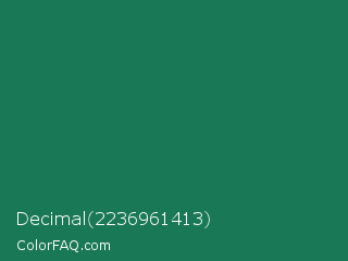 Decimal 2236961413 Color is a dark green color and the nearest color is Deep Green Cyan Turquoise #0e7c61. Hex code #197855 and RGB value is rgb(25,120,85). In RGB color space, this color is composed of 10% red, 47% green, 33% blue, In CMYK color space, this color is composed of 79% cyan, 0% magenta, 29% yellow , 53% black , In HSL color space, this color has a hue angle of 158° , 66% saturation and 28% lightness.