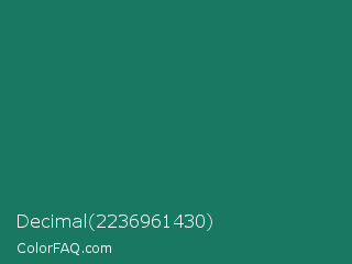 Decimal 2236961430 Color is a dark cyan color and the nearest color is Deep Green Cyan Turquoise #0e7c61. Hex code #197860 and RGB value is rgb(25,120,96). In RGB color space, this color is composed of 10% red, 47% green, 38% blue, In CMYK color space, this color is composed of 79% cyan, 0% magenta, 20% yellow , 53% black , In HSL color space, this color has a hue angle of 165° , 66% saturation and 28% lightness.