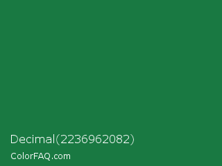 Decimal 2236962082 Color is a dark green color and the nearest color is Dark Spring Green #177245. Hex code #197942 and RGB value is rgb(25,121,66). In RGB color space, this color is composed of 10% red, 47% green, 26% blue, In CMYK color space, this color is composed of 79% cyan, 0% magenta, 45% yellow , 53% black , In HSL color space, this color has a hue angle of 146° , 66% saturation and 29% lightness.