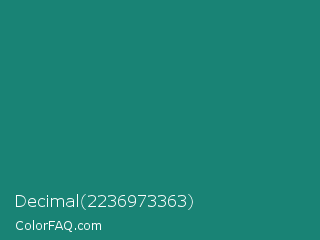 Decimal 2236973363 Color is a normal cyan color and the nearest color is Elm #1c7c7d. Hex code #198375 and RGB value is rgb(25,131,117). In RGB color space, this color is composed of 10% red, 51% green, 46% blue, In CMYK color space, this color is composed of 81% cyan, 0% magenta, 11% yellow , 49% black , In HSL color space, this color has a hue angle of 172° , 68% saturation and 31% lightness.