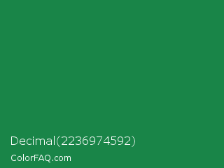 Decimal 2236974592 Color is a normal green color and the nearest color is Salem #097f4b. Hex code #198548 and RGB value is rgb(25,133,72). In RGB color space, this color is composed of 10% red, 52% green, 28% blue, In CMYK color space, this color is composed of 81% cyan, 0% magenta, 46% yellow , 48% black , In HSL color space, this color has a hue angle of 146° , 68% saturation and 31% lightness.