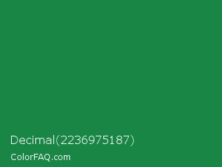 Decimal 2236975187 Color is a normal green color and the nearest color is Salem #097f4b. Hex code #198645 and RGB value is rgb(25,134,69). In RGB color space, this color is composed of 10% red, 53% green, 27% blue, In CMYK color space, this color is composed of 81% cyan, 0% magenta, 49% yellow , 47% black , In HSL color space, this color has a hue angle of 144° , 69% saturation and 31% lightness.