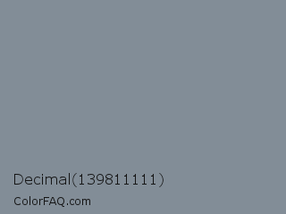 Decimal 139811111 Color is a normal blue color and the nearest color is Roman Silver #838996. Hex code #828d97 and RGB value is rgb(130,141,151). In RGB color space, this color is composed of 51% red, 55% green, 59% blue, In CMYK color space, this color is composed of 14% cyan, 7% magenta, 0% yellow , 41% black , In HSL color space, this color has a hue angle of 209° , 9% saturation and 55% lightness.