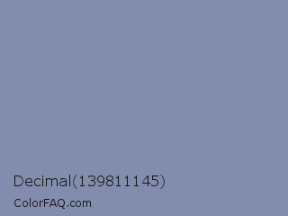 Decimal 139811145 Color is a normal blue color and the nearest color is Cool Grey #8c92ac. Hex code #828dad and RGB value is rgb(130,141,173). In RGB color space, this color is composed of 51% red, 55% green, 68% blue, In CMYK color space, this color is composed of 25% cyan, 18% magenta, 0% yellow , 32% black , In HSL color space, this color has a hue angle of 225° , 21% saturation and 59% lightness.