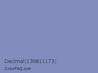 Decimal 139811173 Color is a light blue color and the nearest color is Wild Blue Yonder #7a89b8. Hex code #828dbd and RGB value is rgb(130,141,189). In RGB color space, this color is composed of 51% red, 55% green, 74% blue, In CMYK color space, this color is composed of 31% cyan, 25% magenta, 0% yellow , 26% black , In HSL color space, this color has a hue angle of 229° , 31% saturation and 63% lightness.