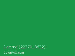 Decimal 2237018632 Color is a normal green color and the nearest color is Spanish Green #009150. Hex code #199748 and RGB value is rgb(25,151,72). In RGB color space, this color is composed of 10% red, 59% green, 28% blue, In CMYK color space, this color is composed of 83% cyan, 0% magenta, 52% yellow , 41% black , In HSL color space, this color has a hue angle of 142° , 72% saturation and 35% lightness.